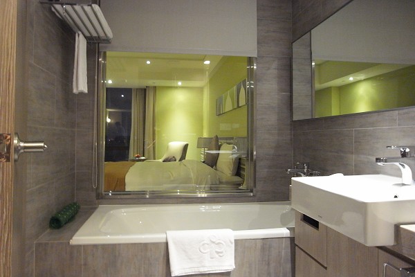 從這個角度可以看到床旁邊的浴室,不知道為什麼出現了motel風的設計,竟然是有附捲簾的透明玻璃窗?