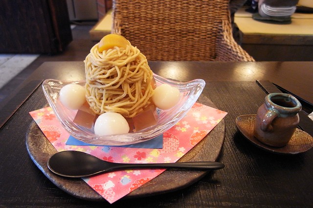 思考該點什麼好,秋季限定每日20份、使用和栗"人丸" 製作的蒙布朗モンブラン已販售終了,那麼就行前決定好的栗薫モンブラン,加價搭配熱焙茶為套餐組合,另外加點和純栗あんみつ。