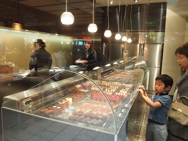 隔天在六本木Tokyo Midtowm店外拍攝的,可以看見冷藏櫃裡就是大約十種蛋糕、閃電泡芙、馬卡烘和巧克力蹦蹦。