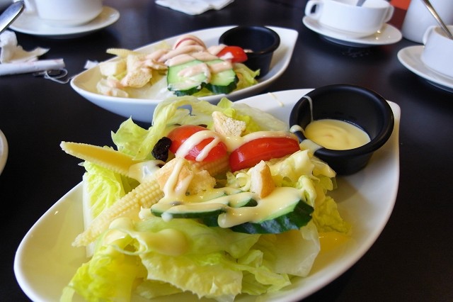 前方是百香果優格醬,後方是千島醬,醬汁調味中規中矩,萵苣的水份有瀝乾,在同類型同價位的店家中,擺盤和份量沒得挑剔。