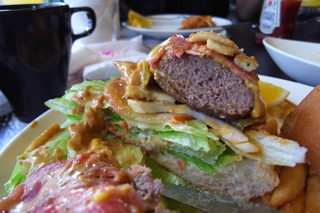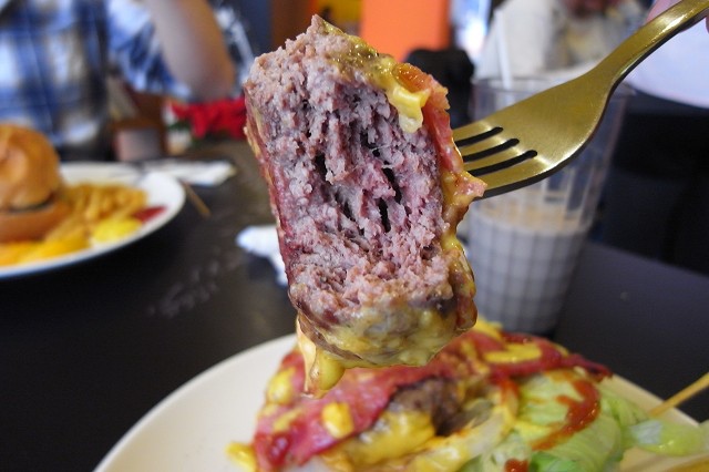 吃到一半捕拍的單層漢堡斷面秀,不難想像雙層確實是個有厚度的漢堡,男性友人不知道這天不知道哪根筋不對勁,還是單純懶得吃完要洗手?竟然秀氣的舉起刀叉,以解構的方式拆開來分層吃,吃漢堡不就應該用雙手壓好、開懷的大口享用嗎?即使滴了滿桌滿手也沒有關係。
