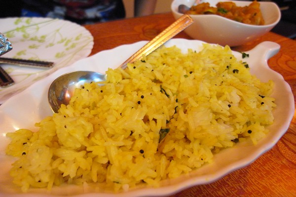 拌入薑黃粉而呈現淡淡的黃色的長米飯,濃厚的咖哩配上有硬度的米飯,就像香蕉和巧克力天生就是絕佳組合般的無可挑剔。