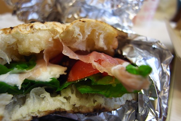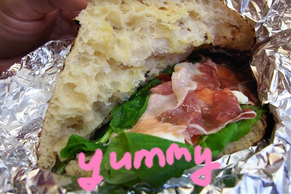 原來裡頭包的是生火腿和生菜、番茄和起司,再淋上橄欖油